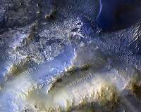 Mars is a dusty planet dominated by vast, dry deserts, with no easily accessible sources of liquid water. Much like on Earth, dust is lifted from Mars's surface by wind and rotating air columns, transported through the atmosphere, and deposited back onto the planet's surface via sedimentation. The Martian dust ...
